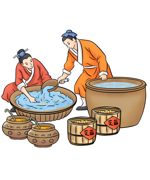 • 漂洗后的芝麻,以鐵鍋碳火慢炒至香味溢出。其中炒芝麻的手法、火候及加料工藝等,都以獨特的秘訣形式由師徒間代代傳承。
